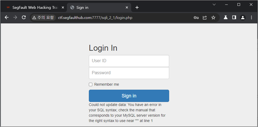 ๊ทธ๋ ๋ค๋ฉด ๋ก๊ทธ์ธ ์ฐฝ์์ SQL Injection์ด ๊ฐ๋ฅํ์ง ํ์ธํด๋ณด์.