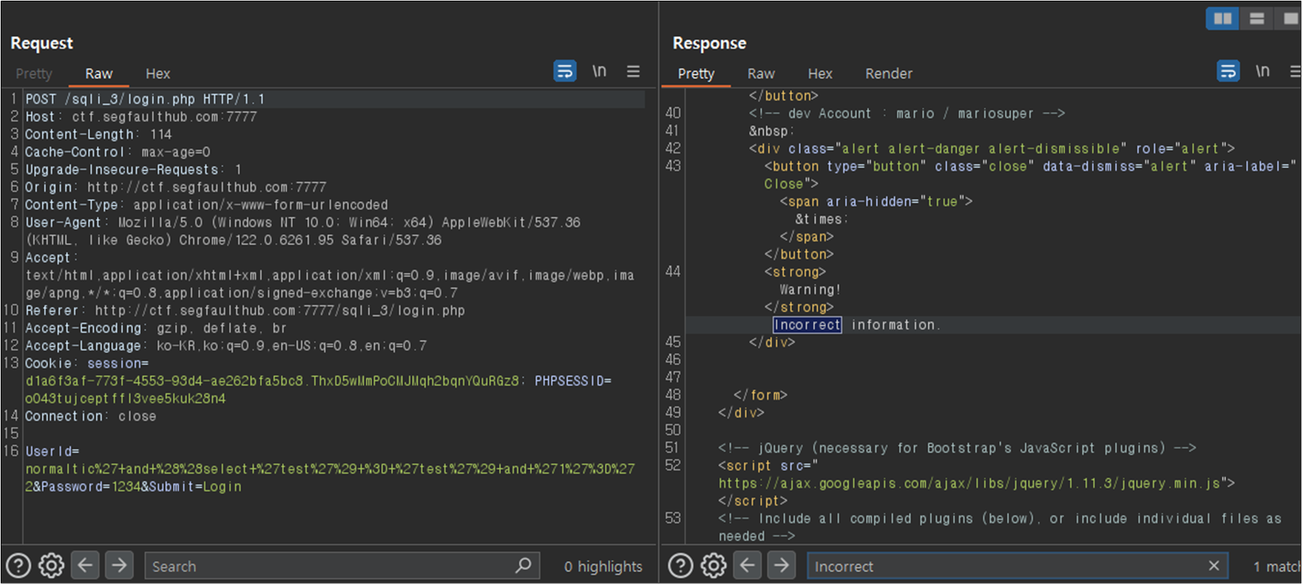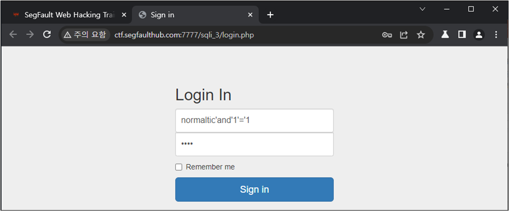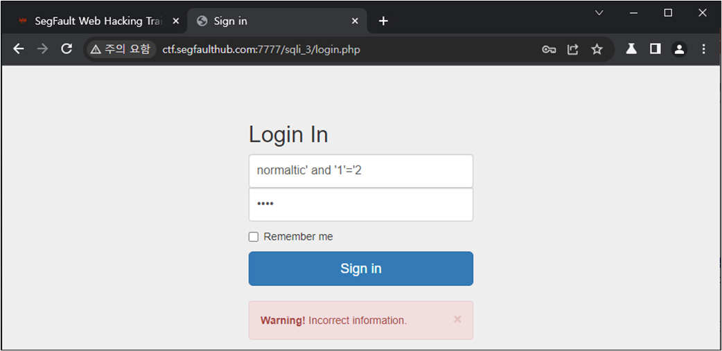 ๊ฑฐ์ง์ธ ๊ฐ์ ๋ํ์ฌ๋ 'and'1'='2์ ๊ฐ์ด ๊ฑฐ์ง์ธ ๊ฐ์ ๋ถ์ฌ ๋ฃ์ฐ์ฃผ๊ณ ํ์ธํ๋ค.
