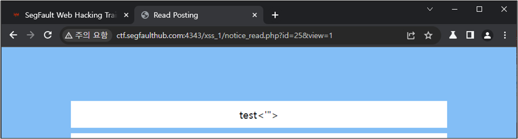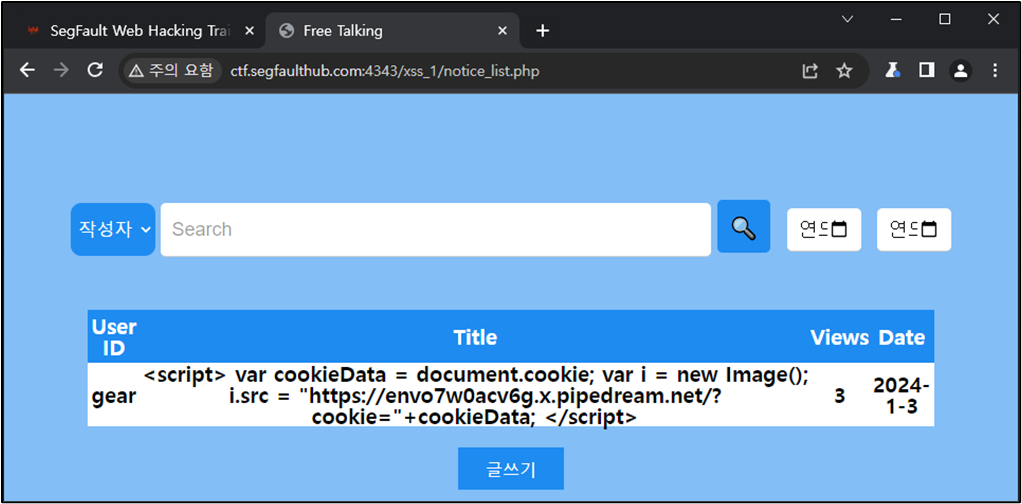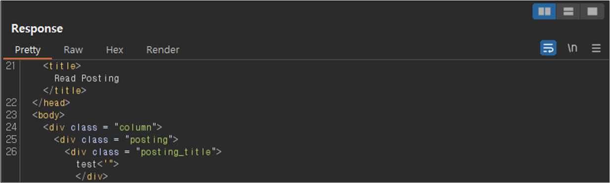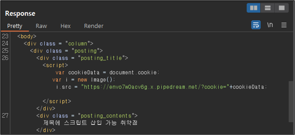 ๋ณธ ๋ฌธ์ ์ ๊ฒฝ์ฐ ๊ธ์ฐ๊ธฐ์ ์ ๋ชฉ ๋ถ๋ถ์ ์คํฌ๋ฆฝํธ๋ฅผ ์ฝ์ ํ ์ ์๋ Stored XSS ์ทจ์ฝ์ ์ผ๋ก HTML Entity ๊ฐ ์ ๋๋ก ์ ์ฉ๋์ง ์์ ์๋ต(Response)์์ ์์ฑํ ์ ๋ชฉ์ด ๊ทธ๋๋ก ๋ ธ์ถ๋๊ณ ์์์ ์ด์ฉํ ์ทจ์ฝ์ ์ด๋ค.