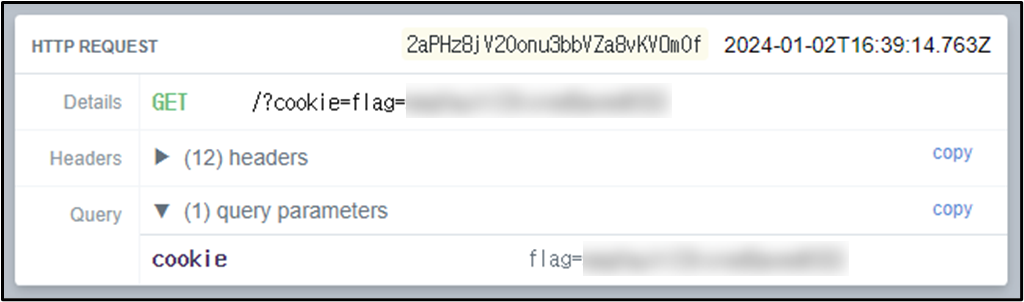 ํ์ทจ๋ ์ฟ ํค(Cookie)๊ฐ ๊ณต๊ฒฉ์ ์ฃผ์(RequestBin)์ผ๋ก ๋ฐ์์์ง๋ ๊ฒ์ ํ์ธํ ์ ์๋ค.