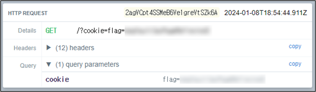 ํ์ทจ๋ ์ฟ ํค(Cookie)๊ฐ ๊ณต๊ฒฉ์ ์ฃผ์(RequestBin)์ผ๋ก ๋ฐ์์ ์ง๋ ๊ฒ์ ํ์ธํ ์ ์๋ค.