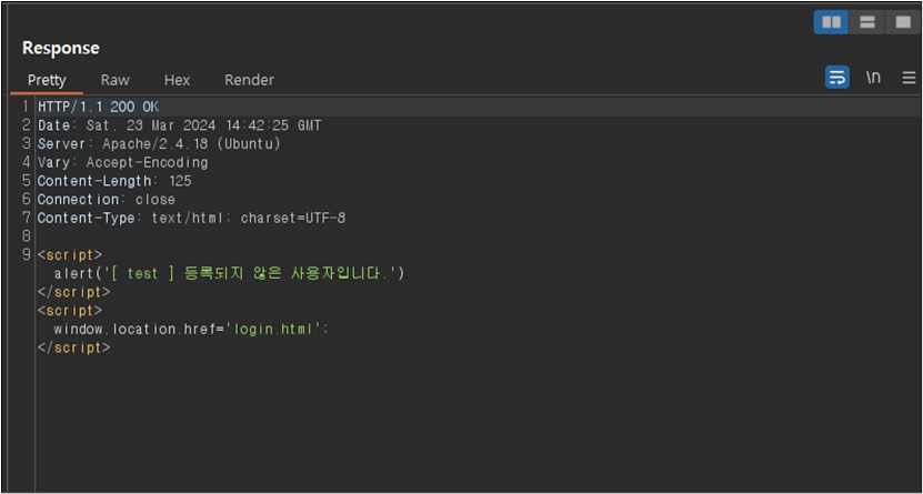 ์์ ๊ฐ์ด ํด๋น ์์ฒญ์ Burp๋ฅผ ์ด์ฉํ์ฌ GET Method๋ก ๋ณ์กฐํ์ฌ ์์ฒญํ์์ ๋ ๋ค์๊ณผ ๊ฐ์ด ๋์ผํ ๊ฒฐ๊ณผ๊ฐ ๋์จ ๊ฒ์ ํ์ธํ ์ ์์๋ค.