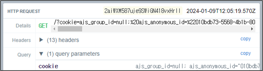 ํ์ทจ๋ ์ฟ ํค(Cookie)๊ฐ ๊ณต๊ฒฉ์ ์ฃผ์(RequestBin)์ผ๋ก ๋ฐ์์ ์ง๋ ๊ฒ์ ํ์ธํ ์ ์๋ค.