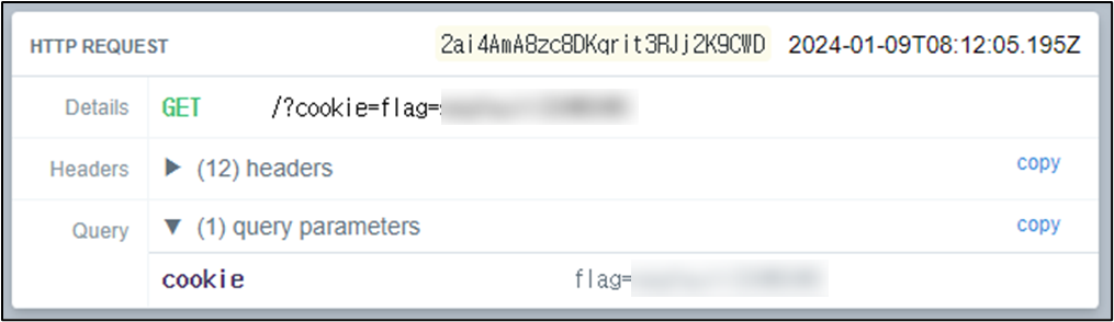 ํ์ทจ๋ ์ฟ ํค(Cookie)๊ฐ ๊ณต๊ฒฉ์์ ์ฃผ์(RequestBin)์ผ๋ก ๋ฐ์์ ์ง๋ ๊ฒ์ ํ์ธํ ์ ์๋ค.
