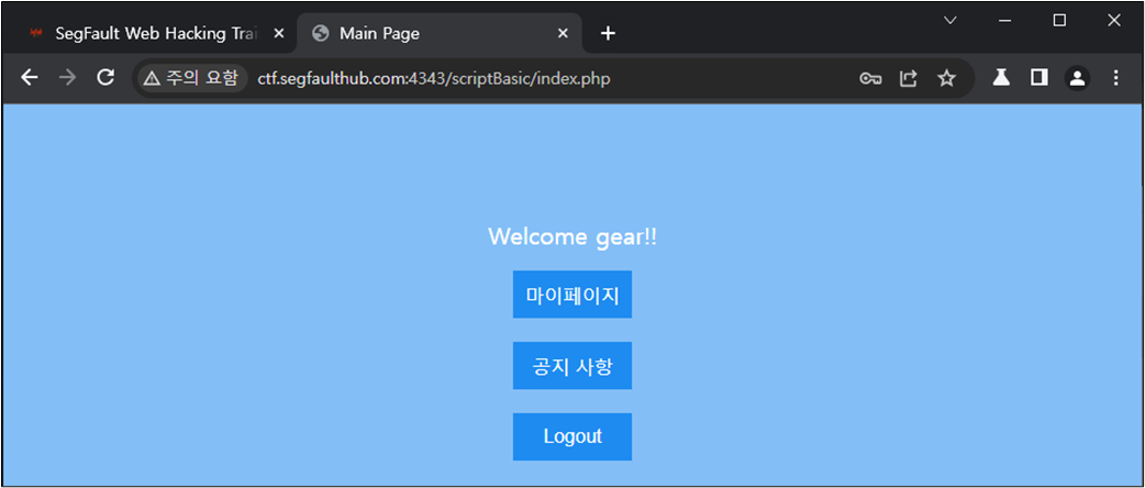 ๋ฌธ์ ์์ Mypage์์ XSS ์ทจ์ฝ์ ์ด ์๋ค๊ณ ์๋ ค์ฃผ๊ณ ์๋ค. ๊ทธ๋ฌ๋ฏ๋ก ์ฐ์ ๋ง์ดํ์ด์ง์ ์ ์ํด๋ณธ๋ค.