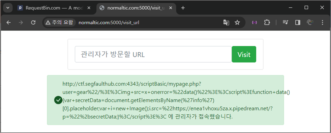 XSS ์ทจ์ฝ์ ์ ์ด์ฉํ์ฌ ์ํ๋ ์ ๋ณด๋ฅผ ์ฐพ๊ณ ํด๋น ๊ฐ์ ๊ฐ์ ธ์ค๊ธฐ ์ํ ๋งํฌ๋ฅผ ์์ URL์ ์ ๋ ฅํ๋ฉด ๊ณต๊ฒฉ์ ์๋ฒ(RequestBin)๋ก ์ ๋ณด๊ฐ ๋ ์์ค๋ ๋ฐฉ์์ด๋ค.