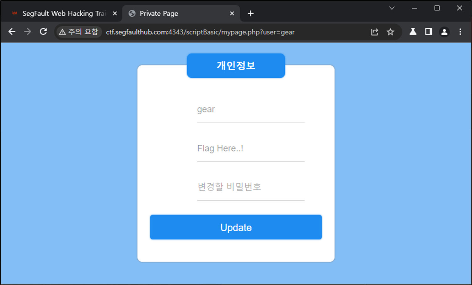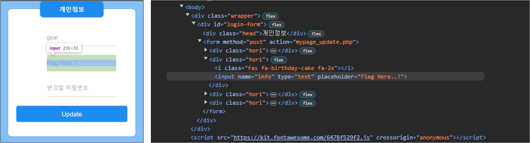 ๋ง์ดํ์ด์ง์ ์ค์์ ๋ณด์ ํด๋นํ๋ ๋ถ๋ถ์ Flag Here..! ๋ผ๊ณ ์ ํ์๋ Info ๋ถ๋ถ์ด๋ค. ๊ด๋ฆฌ์์ Info๋ฅผ ๋ฐ์์์ผ ํ๊ธฐ ๋๋ฌธ์ ๊ด๋ฆฌ์๊ฐ ํด๋น ํ์ด์ง์ ์ ์ํ์ ๋ Info ๋ถ๋ถ์ ์ ํ์๋ ๊ฐ์ ๊ฐ์ ธ์์ผํ๋ค.