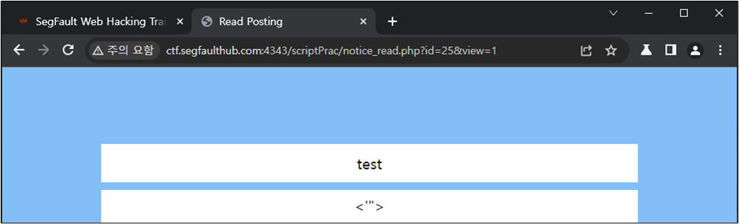 ์์ ๊ฐ์ด ์คํฌ๋ฆฝํธ์ ์ํฅ์ ์ค ์ ์๋ < ' " > ๊ฐ ๊ทธ๋๋ก ์ถ๋ ฅ๋๋์ง ํ์ธํ๋ค.