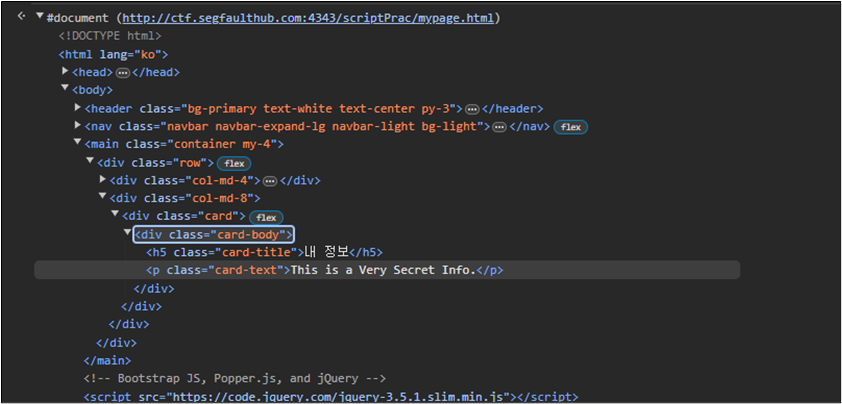 ์ค์ ์ค์์ ๋ณด๊ฐ ์๋ ํ์ด์ง์ card-text๋ฅผ ๊ฐ์ ธ์ค๊ธฐ ์ํ ํ์ด๋ก๋(Payload)๋ฅผ ์์ฑํ๋ค.