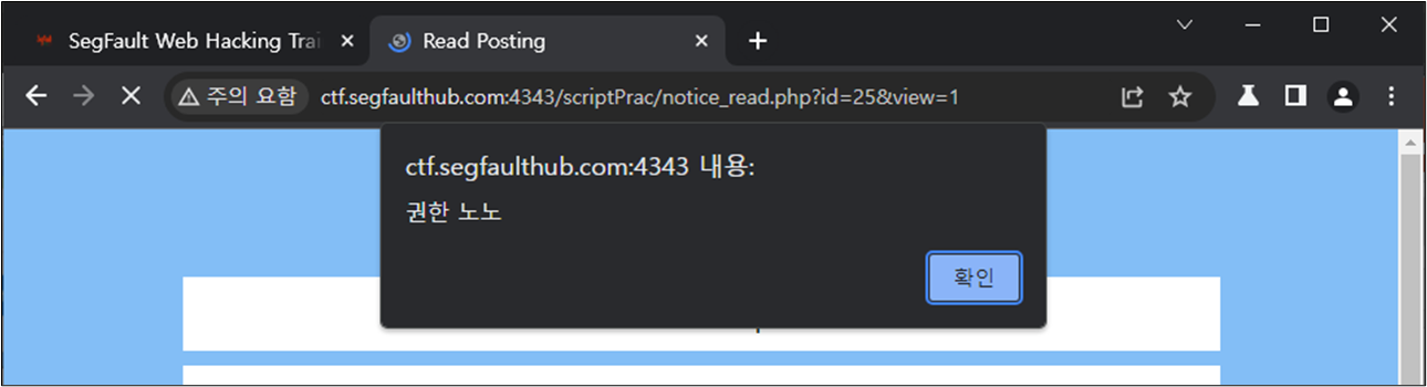ํด๋น ๊ธ์ ์ฝ๊ธฐ์ํด ์ ๊ทผํด๋ณด๋ฉด ๋ค์๊ณผ ๊ฐ์ด ๊ถํ์ด ์๋ค๋ ์๋ฆผ์ฐฝ์ด ๋ฌ๋ค. ํ์ง๋ง ์ด๊ฒ์ ๊ด๋ฆฌ์๊ฐ ์ ๊ทผํ๋ค๋ฉด ์์ ์คํฌ๋ฆฝํธ์ ์ํด ์ํ๋ ์ ๋ณด๋ฅผ ๊ณต๊ฒฉ์ ์ฃผ์๋ก ๋ณด๋ด์ค ๊ฒ์ด๋ค.