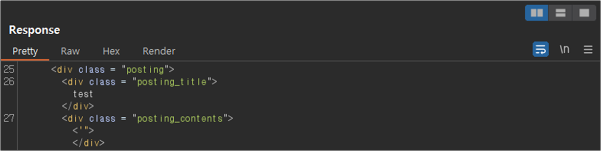 ์๋ต(Response)์ ํ์ธํด๋ณธ ๊ฒฐ๊ณผ ๊ธ์ ๋ด์ฉ ๋ถ๋ถ์์ ์ ๋ ฅ๊ฐ์ด ๊ทธ๋๋ก ์ถ๋ ฅ๋๊ณ ์๋ ๊ฒ์ ํ์ธํ์๋ค.