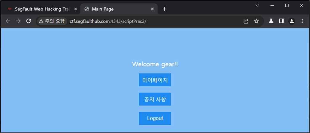 ๋ง์ดํ์ด์ง์ ์ ๋ณด๋์ flag๊ฐ ์จ๊ฒจ์ ธ์๋ค๊ณ ํ์ผ๋ฏ๋ก ์ฐ์ ๋ง์ดํ์ด์ง๋ก ์ ์ํด๋ณธ๋ค.