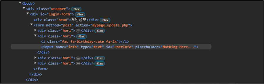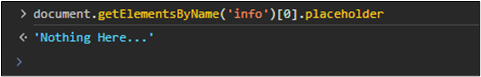 ์์ ๊ฐ์ด ํด๋น ๋ถ๋ถ์ ๊ตฌ์กฐ๋ info๋ผ๋ ์ด๋ฆ์ input ํ๊ทธ์ placeholder์ด๋ค. ๊ทธ๋ฌ๋ฏ๋ก ์ด๋ฅผ ๋ถ๋ฌ์ค๋ฉด ๋ค์๊ณผ ๊ฐ๋ค.