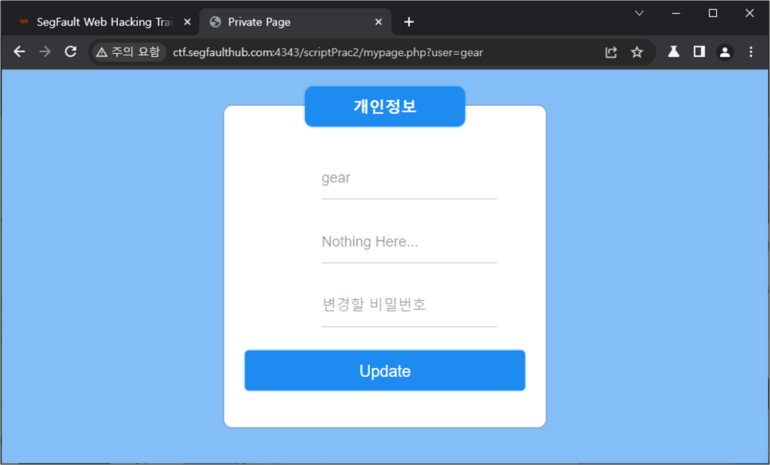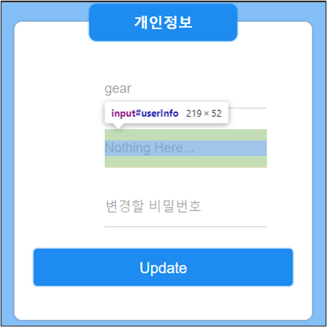 ๋ง์ดํ์ด์ง์ ์ ๋ณด๋์ Nothing Here... ๋ผ๊ณ ์ฐ์ฌ์ ธ ์๋ ๋ถ๋ถ์ด๋ค. ๊ด๋ฆฌ์์ Info๋ฅผ ๋ฐ์์์ผ ํ๊ธฐ ๋๋ฌธ์ ๊ด๋ฆฌ์๊ฐ ํด๋น ํ์ด์ง์ ์ ์ํ๋๋ก ์ ๋ํ์ฌ ํด๋น ๋ถ๋ถ์ ์ ํ์๋ ๊ฐ์ ๊ฐ์ ธ์์ผํ๋ค.