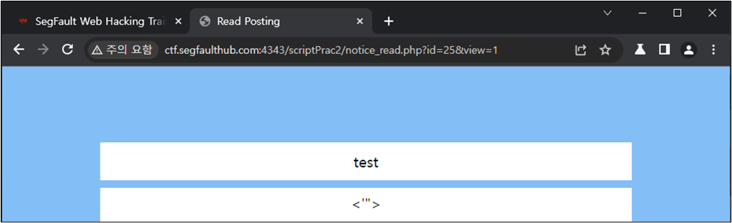 ๊ธ์ฐ๊ธฐ ๊ธฐ๋ฅ์ XSS ์ทจ์ฝ์ ์ด ์๋์ง ํ์ธํ๊ธฐ ์ํด ์คํฌ๋ฆฝํธ์ ์ํฅ์ ์ค ์ ์๋ < ' " >๊ฐ ๊ทธ๋๋ก ์ถ๋ ฅ๋๋์ง ํ์ธํด๋ณธ๋ค.