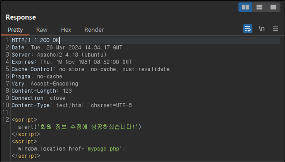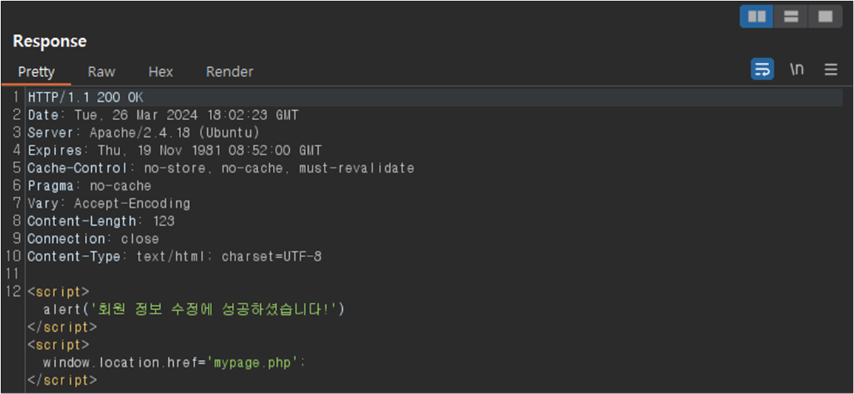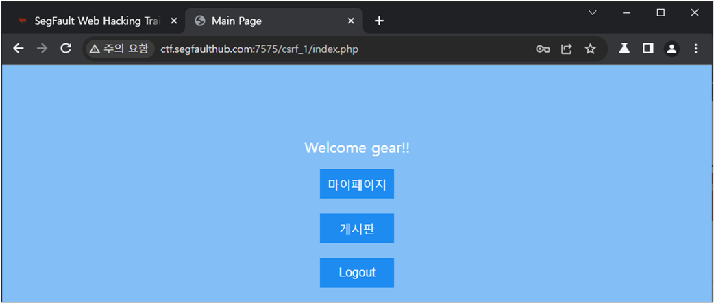 ๋น๋ฐ๋ฒํธ๋ฅผ ๋ณ๊ฒฝํ๋ CSRF ์ทจ์ฝ์ ์ ์ด์ฉํ ๊ฒ์ด๋ฏ๋ก ์ฐ์ ๋ง์ดํ์ด์ง์ ๋ค์ด๊ฐ์ ๋น๋ฐ๋ฒํธ ๋ณ๊ฒฝ์ ์๋ํ์ฌ ๊ทธ ๊ณผ์ ์ ํ์ธํด๋ณธ๋ค.