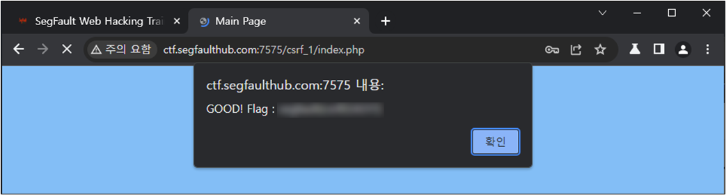 ๊ด๋ฆฌ์ ๊ณ์ ์ ๋ณ๊ฒฝ์ํจ ๋น๋ฐ๋ฒํธ๋ก ์ ๋ ฅํ์ฌ ๋ก๊ทธ์ธํ๋ฉด ์ฑ๊ณต์ ์ผ๋ก ๋ก๊ทธ์ธ๋๊ณ ๋ค์๊ณผ ๊ฐ์ด ์๋ฆผ์ฐฝ์ Flag๊ฐ์ด ์ถ๋ ฅ๋๋ ๊ฒ์ ํ์ธํ ์ ์๋ค.