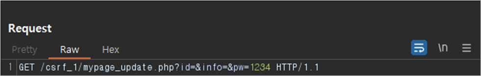 ๊ณต๊ฒฉํ ์์ด๋์ CSRF ๊ณต๊ฒฉ ์ ๋ณด๊ฐ ๋ด๊ฒจ์๋ URL์ ์ ๋ ฅํ๋ฉด ํด๋น ์์ด๋์ ๋น๋ฐ๋ฒํธ๊ฐ ๋ณ๊ฒฝ๋๊ฒ ๋๋ค.
