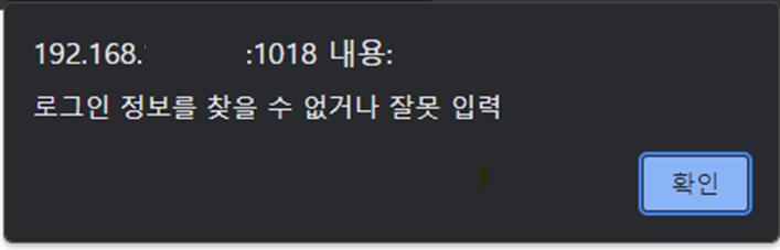 - alert("๋ก๊ทธ์ธ ์ ๋ณด๋ฅผ ์ฐพ์ ์ ์๊ฑฐ๋ ์๋ชป ์ ๋ ฅ"); : ์์ด๋ or ๋น๋ฐ๋ฒํธ๊ฐ ์ผ์นํ์ง ์๋ ๊ฒฝ์ฐ ์๋จ์ ๊ฒฝ๊ณ ์ฐฝ ์ถ๋ ฅ