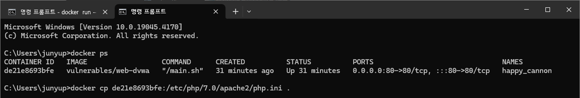 PHP ์ค์ ์ ์์ ํ๊ธฐ ์ํด cmd ์ฐฝ์์ ๋ค์๊ณผ ๊ฐ์ ๋ช ๋ น์ด๋ฅผ ์ ๋ ฅํ์ฌ Docker ์ด๋ฏธ์ง ๋ด์ ํ์ผ์ Host PC๋ก ๊ฐ์ ธ์จ๋ค.