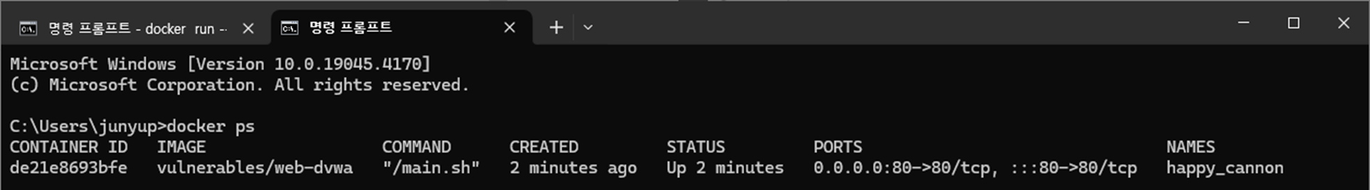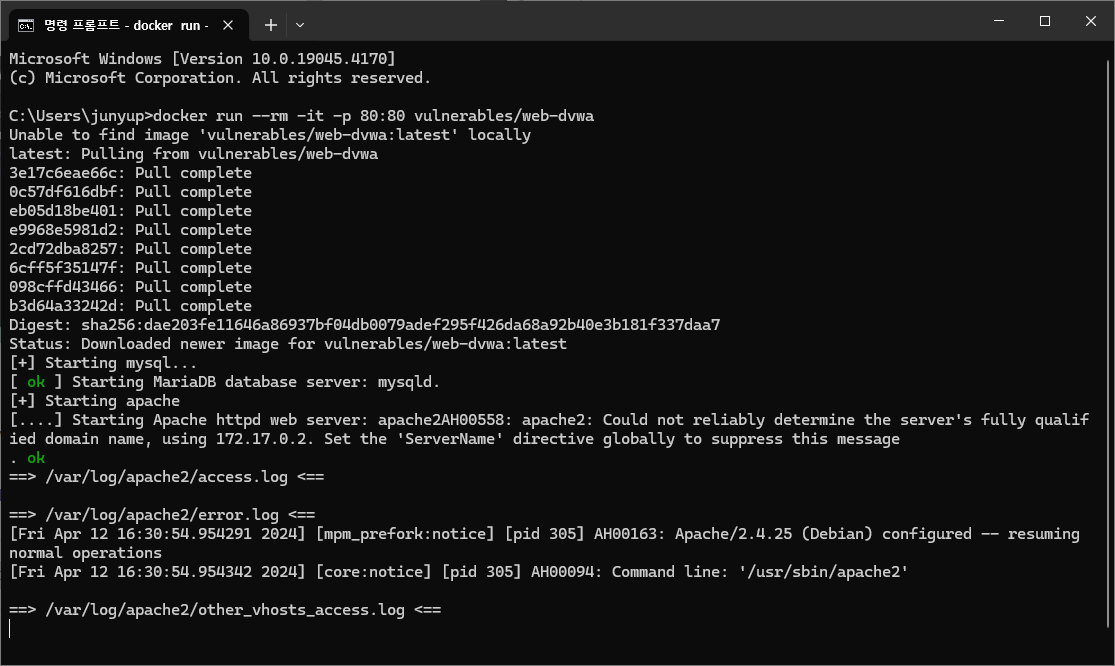 Docker๊ฐ ์ค์น๋ ์ํ์์ DVWA ์ด๋ฏธ์ง๋ฅผ ๊ตฌ๋ํ๊ธฐ ์ํด cmd ์ฐฝ์ ์๋์ ๊ฐ์ ๋ช ๋ น์ด๋ฅผ ์ ๋ ฅํ๋ค.