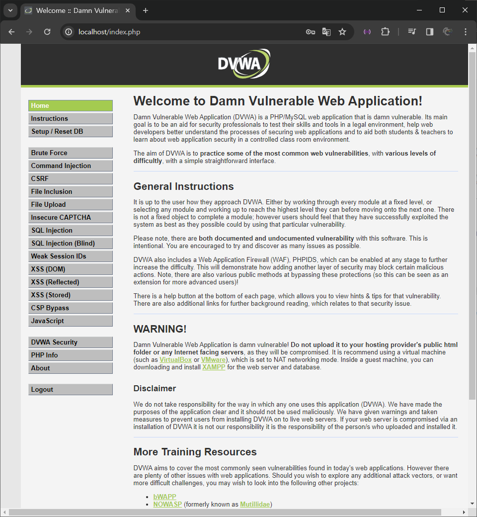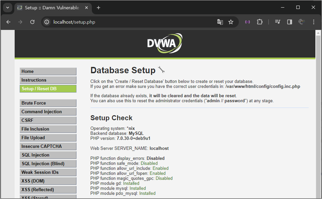 docker run --rm -it -d -p 127.0.0.1:80:80 vulnerables/web-dvwa:patched