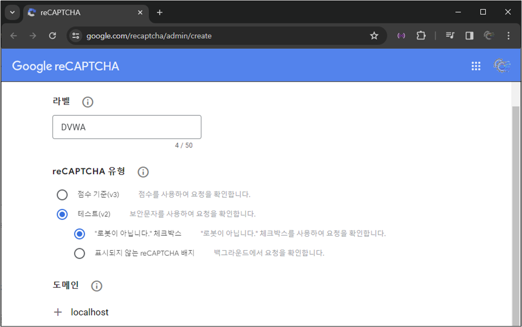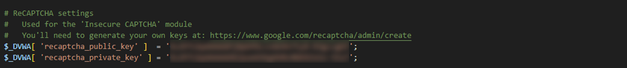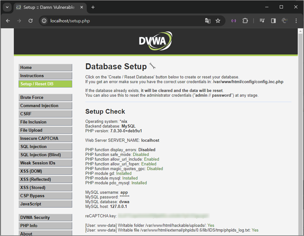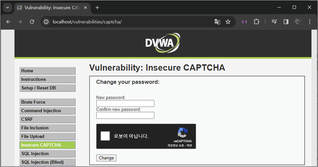 ์ค์ ์๋ฃ ํ DVWA์ ์ฌ์ ์ํ๋ฉด reCAPTCHA key๊ฐ ์์ฑ๋์ด ์๋ ๊ฒ์ ํ์ธํ ์ ์๋ค.