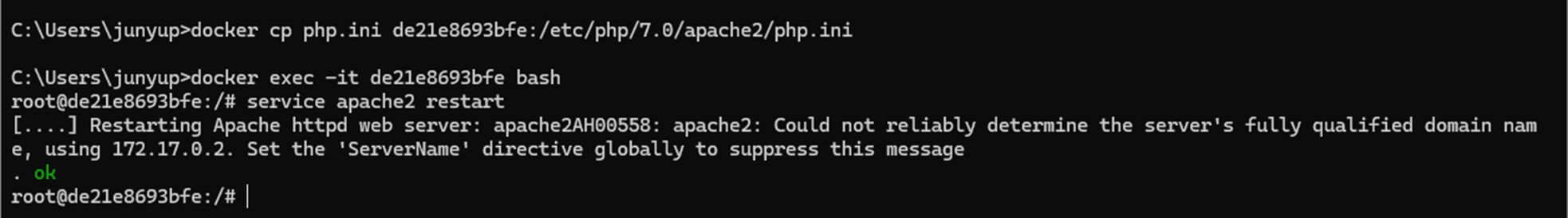 ๊ทธ ํ cmd ์ฐฝ์์ docker cp ๋ช ๋ น์ด๋ฅผ ์ด์ฉํ์ฌ ํ์ผ์ ๋ถ์ฌ๋ฃ๊ธฐ ํ ํ ์ง์ ์ ์ํ์ฌ ์์์ apache๋ฅผ ์ฌ์์ํ๋ค.