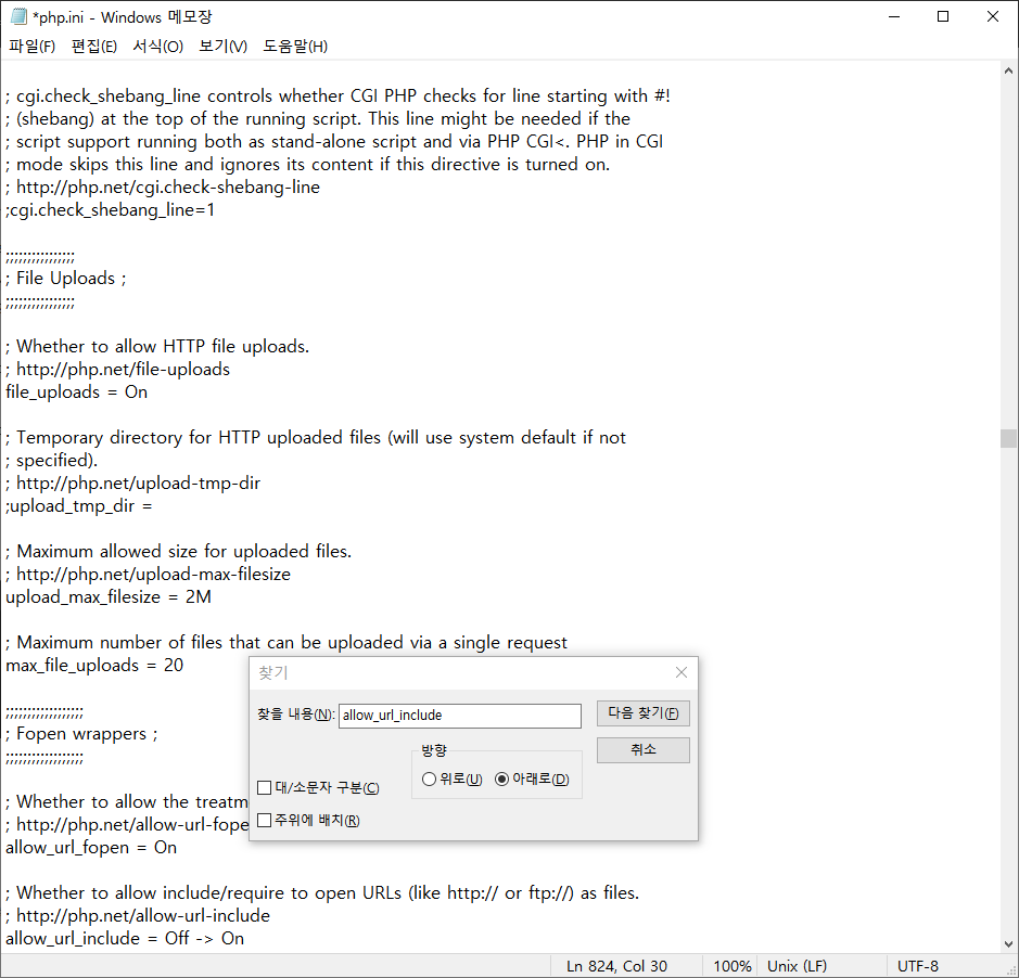 ์์ ๊ฐ์ด allow_url_include ํญ๋ชฉ์ ๊ฒ์ํ์ฌ Off๋ก ์ค์ ๋์ด ์๋ ๊ฒ์ On์ผ๋ก ์์ ํ ์ ์ฅํ๋ค.