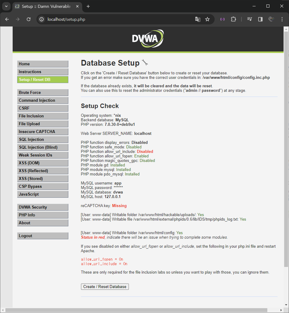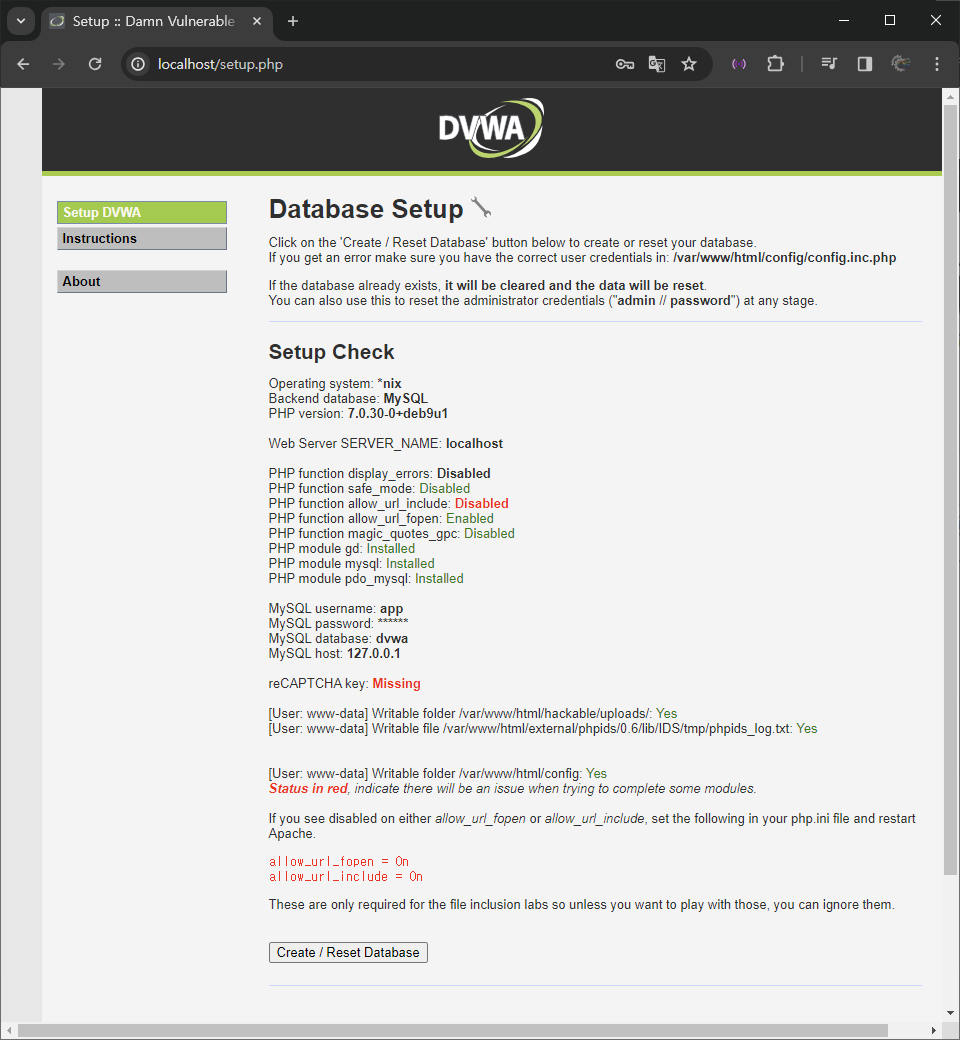์์์ ๋ณด๋ฉด ์ค์น ์งํ์ DVWA๋ ๋ค์์ ๋ ๊ฐ์ง ๊ธฐ๋ฅ PHP function allow_url_include: Disabled , reCAPTCHA key: Missing ์ด ๋นํ์ฑํ ๋์ด ์๋ ๊ธฐ๋ฅ์ ํ์ธํ ์ ์๋ค. ๊ฐ ๊ธฐ๋ฅ์ด ํ์ํ ๊ฒฝ์ฐ๋ฅผ ๋๋นํ์ฌ ํ์ฑํ ์์ ์ ์งํํ๊ณ ์ด ์์ ๋ด์ญ์ ์ ์ฅํด๋ณด๋ ค ํ๋ค.