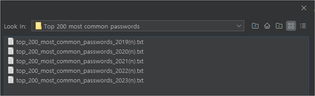 μμ λͺ©λ‘ μ€μ κ°μ₯ μ΅κ·Όμ top 200 most common passwords 2023μ μ΄μ©νλ€.