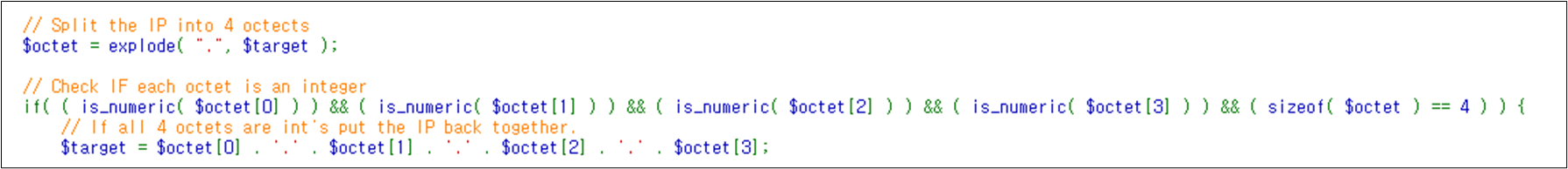์์ ๊ณผ์ ์์ ์นํ์ด์ง๊ฐ ์ฌ์ฉ์๊ฐ ์ ๋ ฅํ ๊ฐ์ ๋ํ์ฌ ์ ๋๋ก ๊ฒ์ฌ๋ฅผ ํ์ง ์๋๋ค๋ฉด, ๊ณต๊ฒฉ์๋ IP์ฃผ์ ๋ค์ ๋ค๋ฅธ ์์คํ ๋ช ๋ น์ด๋ฅผ ์ถ๊ฐ๋ก ์ ๋ ฅํ์ฌ ์น ์๋ฒ์์ ์ํ๋ ์์คํ ๋ช ๋ น์ด๋ฅผ ์ฌ์ฉํ ์ ์๊ฒ๋๋ค.
