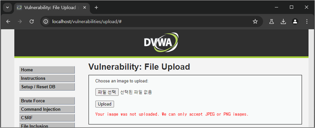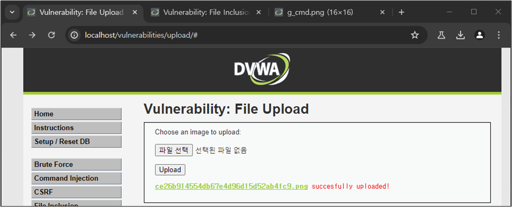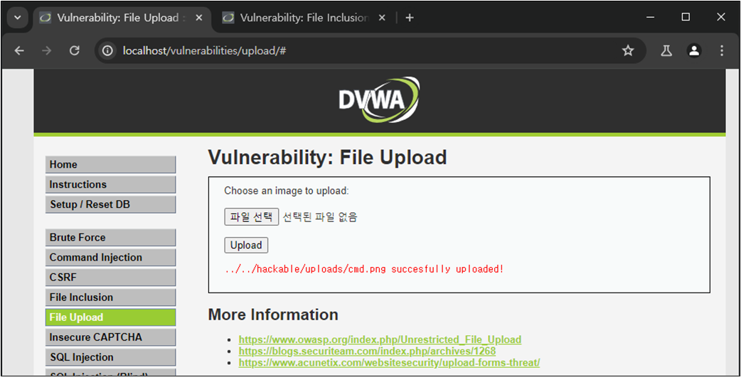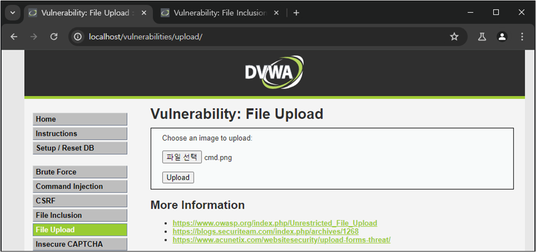 λ§μΉ¨ Vulnerability: File Upload high levelμμ μ λ‘λν μ΄λ―Έμ§ μΉμμ κ²½μ°, Vulnerability: File Inclusion high levelμ μ·¨μ½μ μ΄ μ‘΄μ¬νλ―λ‘ μ΄λ₯Ό μ΄μ©ν΄λ³Έλ€.