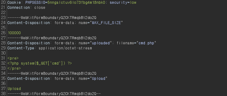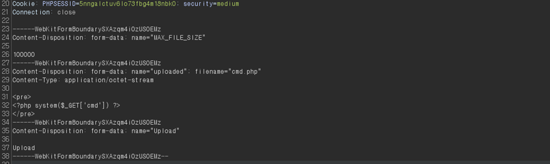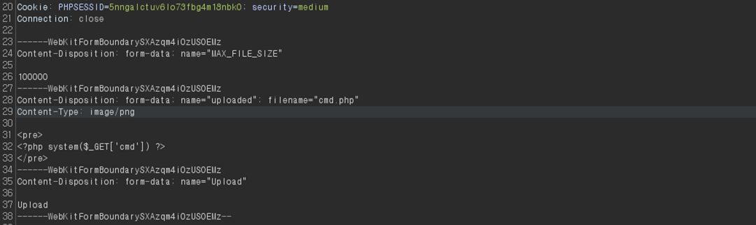 μΉ λΈλΌμ°μ λ νμ₯μλ₯Ό κΈ°λ°μΌλ‘ MIMEμ κ²°μ νκΈ° λλ¬Έμ cmd.php νμΌμ νμ₯μλ₯Ό λ€λ₯Έ νμ₯μλ‘ λ³κ²½νμ¬ μ λ‘λνλ κ³Όμ μμ μΉ νλ‘μ(Burp Suite)λ₯Ό μ΄μ©νμ¬ νμ₯μλ₯Ό λ³μ‘°νμ¬ MIME-Typeμ μμ΄κ±°λ, cmd.php νμΌμ μ λ‘λ νλ κ³Όμ μμ MIME-Typeμ νμ©νλ νμμΌλ‘ λ³μ‘°νλ λ°©μμΌλ‘ μ°νκ° κ°λ₯νλ€.