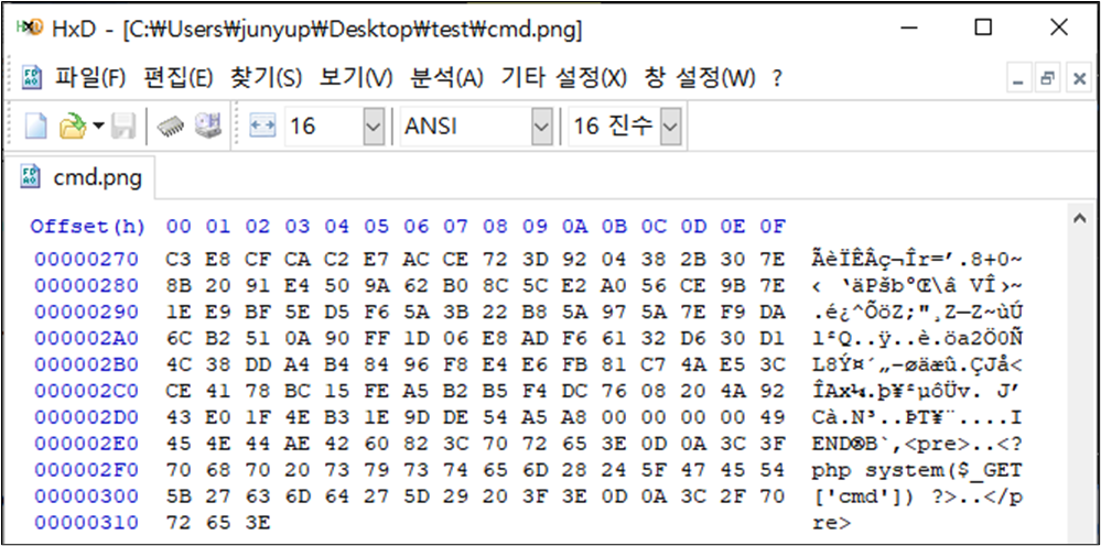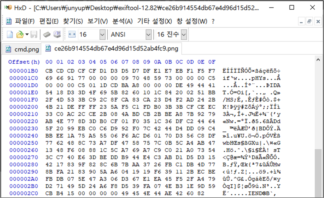μμ κ°μ΄ Hex Editor, HxDλ₯Ό μ΄μ©νμ¬ μ΄λ―Έμ§μ λ§μ§λ§μ μΉμμ μ½μ νλ€.