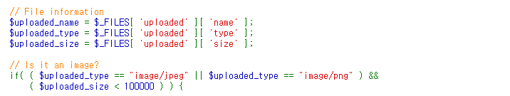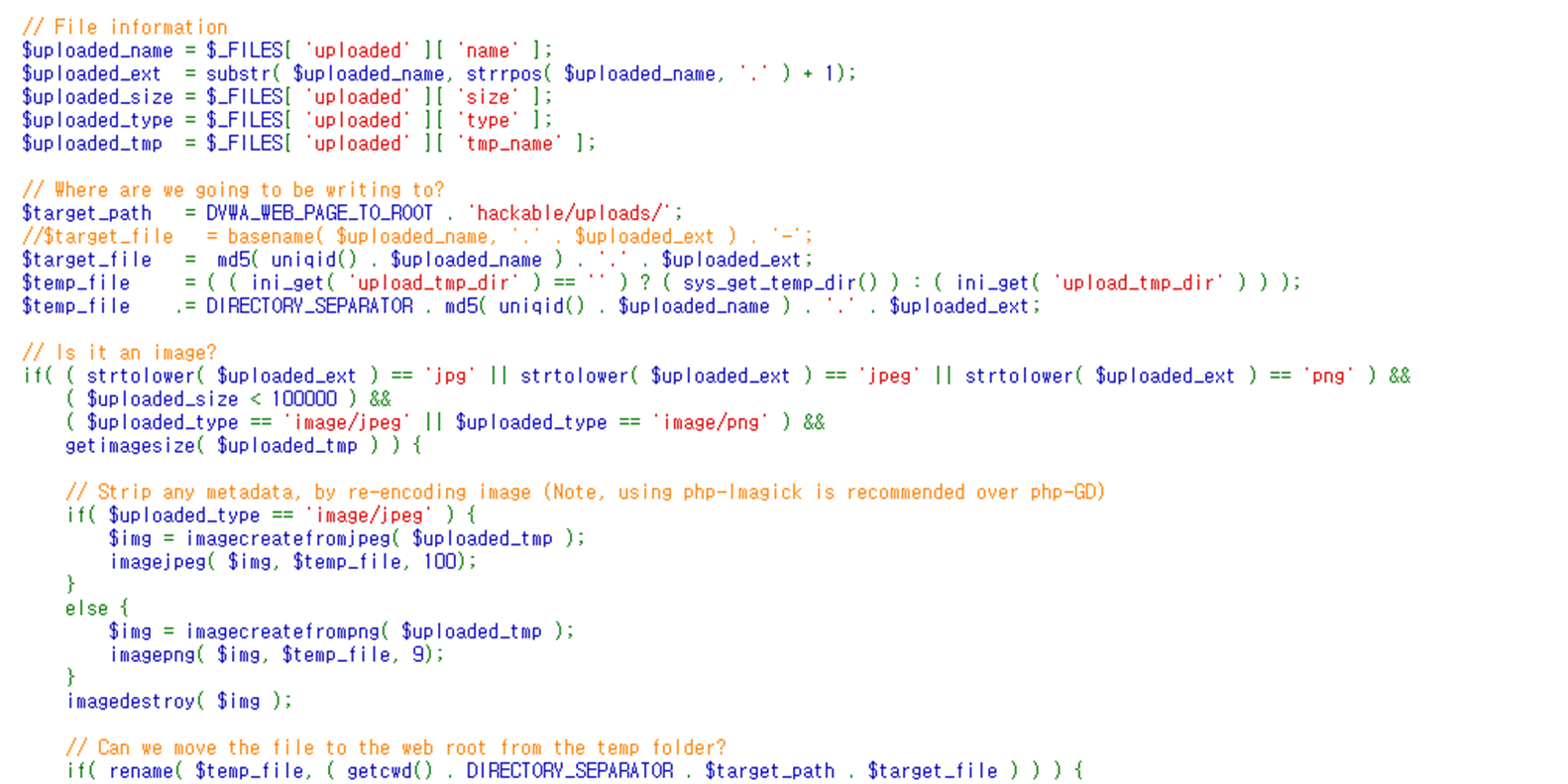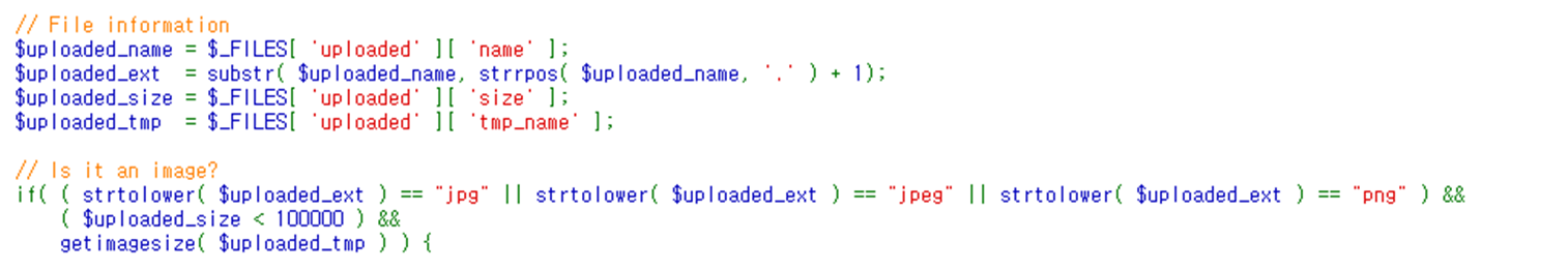 High λ 벨μ κ²½μ°, νμΌμ νμ₯μμ λνμ¬ λμλ¬Έμ ꡬλΆμμ΄ jpg, jpeg, png μΈ κ²½μ°μλ§ νμΌ μ λ‘λλ₯Ό νμ©νλ€. λν getimagesize() ν¨μκ° FALSEκ° μλμ΄μΌ νλλ°, μ€μ μ΄λ―Έμ§ νμΌμ΄ μλ κ²½μ°μλ getimagesizeμ return κ°μ΄ FASLEμ΄λ€.