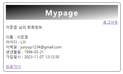 - session ๋ณ์์ ์ ๋ณด๋ฅผ ๊ธฐ๋ฐ์ผ๋ก, SELECT ๋ฅผ ์ด์ฉํ์ฌ ํ์ฌ ์ ์ ์ ์ ๋ณด๋ฅผ ๊ฐ์ ธ์ด