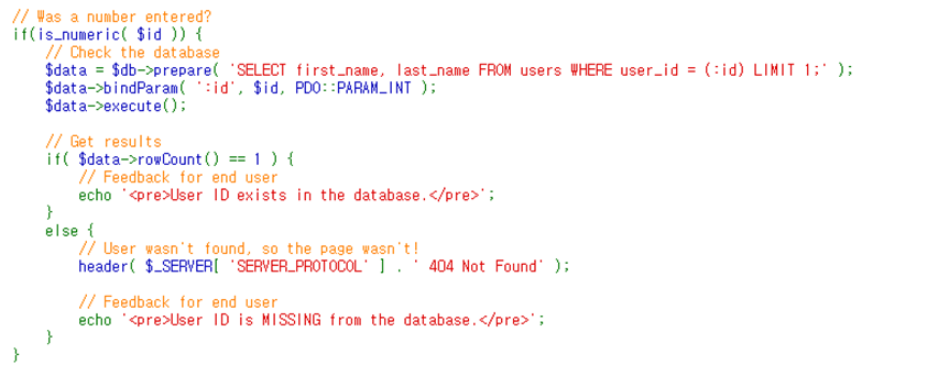 Impossible ๋ ๋ฒจ์ ๊ฒฝ์ฐ ์ ๋ ฅ ๊ฐ์ ๋ํ์ฌ ์ซ์๋ง ์ ๋ ฅ ๊ฐ๋ฅํ๋๋ก ํ๊ธฐ ๋๋ฌธ์, SQL Injection์ด ๋ถ๊ฐ๋ฅํ๋ค.